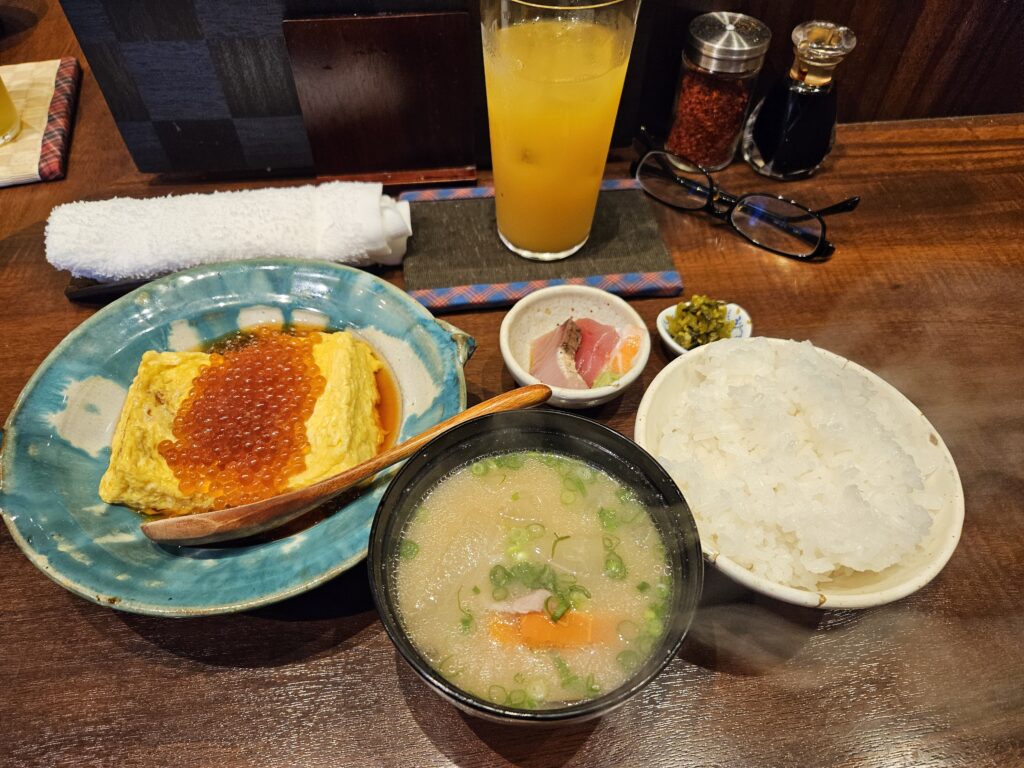 I ordered the Dashi-maki set with ikura (salmon roe) and a glass of orange juice. The salty ikura paired perfectly with the rice. From the very first bite, my appetite grew. I finished my first bowl of rice quickly and asked the staff: